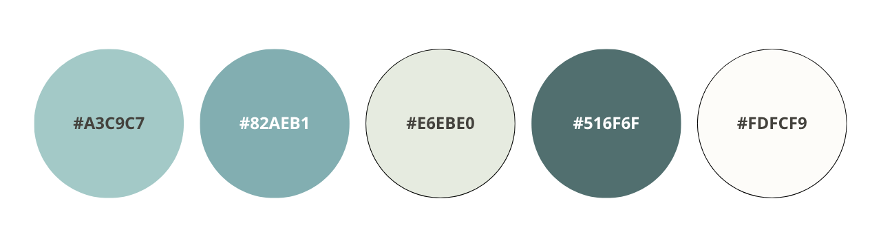 #A3C9C7 — Dusty Aqua; #82AEB1 — Muted Teal Blue; #E6EBE0 — Soft Sage Gray; #516F6F — Steady Slate; #FDFCF9 — Gentle Neutral