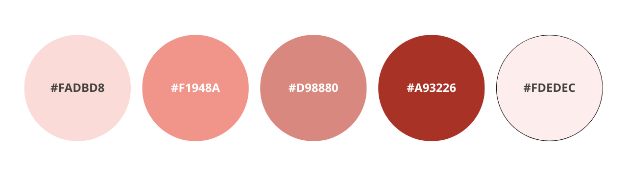 #FADBD8 — Blush; #F1948A — Rosy Coral; #D98880 — Terracotta Rose; #A93226 — Grounded Red; #FDEDEC —Light Pink Wash